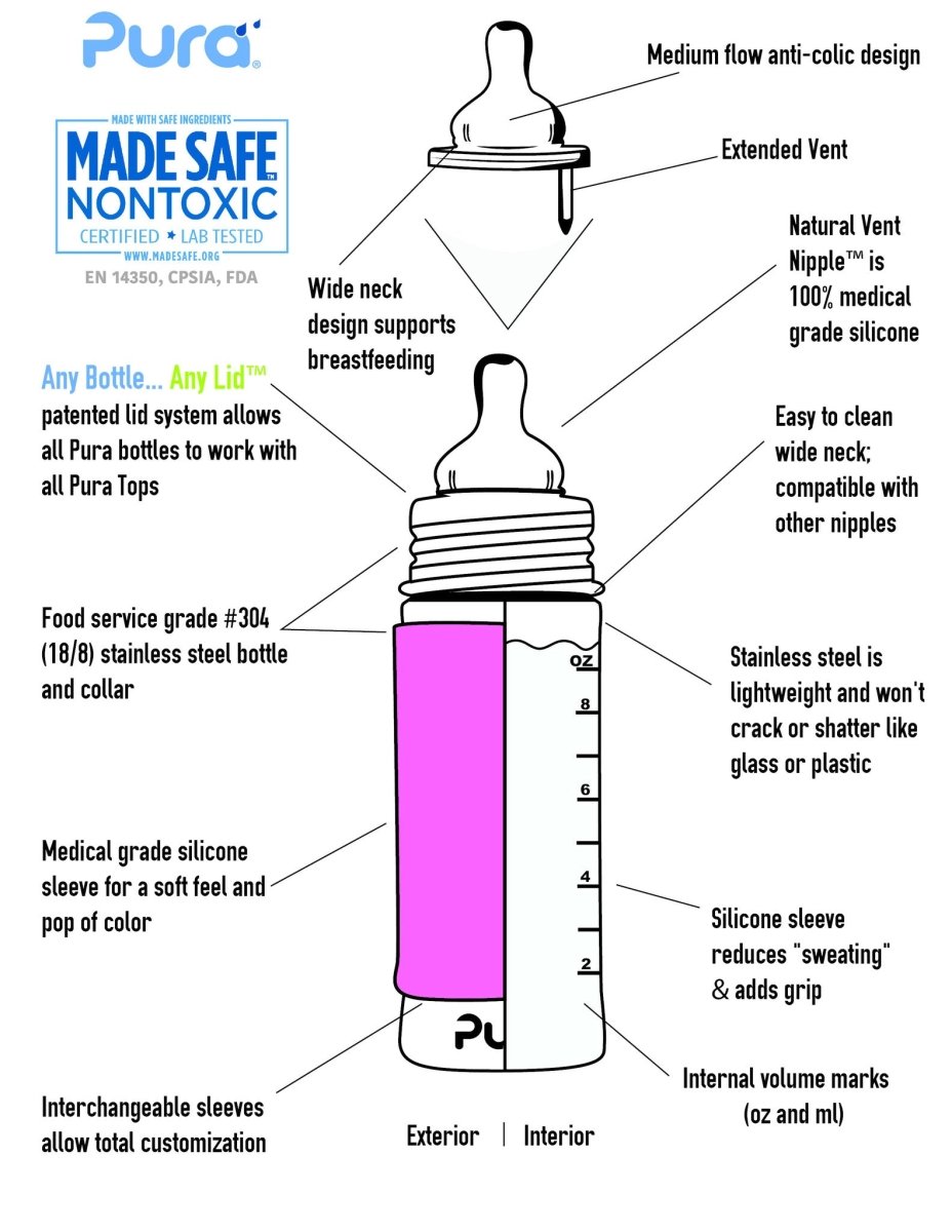 Diese preisgekrönte Nuckelflasche aus Edelstahl ist die perfekte Trinkflasche für Babys und 100% plastikfrei! Die Flasche ist plastikfrei und damit sicher, umweltfreundlich und vor allem praktisch. Der Deckel ist austauschbar, so dass die Flasche auf verschiedene Arten verwendet werden kann. So kann die Flasche von der Nuckelflasche über den Strohhalmbecher bis hin zur Sportflasche mitwachsen. Pura ist das einzige Produkt auf der Welt, das von MadeSafe als NONToxic zertifiziert wurde.org. Warum Pura: SICHER: Die einzige 100% plastikfreie Flasche... also kein Sicherheitsrisiko; Hergestellt aus hochwertigem Edelstahl (#304 oder 18/9); Silikon von antibakterieller medizinischer Qualität; MadeSafe™-zertifiziert; Verlängere die Lebensdauer von Pura Flaschen durch das Auswechseln der Kappen. Dadurch halten die Flaschen ein Leben lang; frei von BPA, PVC, Phthalaten und Blei; die Flasche wird mit einem Silikonsauger mit mittlerem Durchfluss und einer Silikon-Reisekappe geliefert; Fassungsvermögen: 325 ml; interne Volumenmarkierung: 250 ml. Pura Die Sauger sind so konzipiert, dass sie den variablen Fluss des Stillens nachahmen. Diese Schnuller sind so konzipiert, dass sie perfekt in den Mund deines Babys passen. Das patentierte Belüftungsventil ist extra lang und hilft, Koliken und Milchrückfluss zu verhindern. Pura Flaschen können zum Einfrieren von Flüssigkeit verwendet werden. Verwende dazu die separat erhältliche Silikon-Dichtscheibe. Überfülle die Flasche nicht, denn die Flüssigkeit dehnt sich aus, wenn sie gefriert (nicht mehr als 275 ml in der 325-ml-Flasche). Reinigung und Sterilisation Alle Teile der Pura Flaschen und des Zubehörs sind spülmaschinenfest. Du kannst sie auch von Hand mit einer milden Seife und einer Flaschen- und Nuckelbürste waschen. Vermeide die Verwendung von scharfen Reinigungsmitteln, da sie die Silikonteile beschädigen können. Das Zubehör hält länger, wenn es sanft von Hand gereinigt wird. Pura Produkte können auch sterilisiert werden. Lege die Flasche und das Zubehör für 5-10 Minuten in das kochende Wasser, nachdem der Topf vom Herd genommen wurde und das Wasser nicht mehr aktiv kocht. Silikonteile können auch in der Mikrowelle sterilisiert werden.