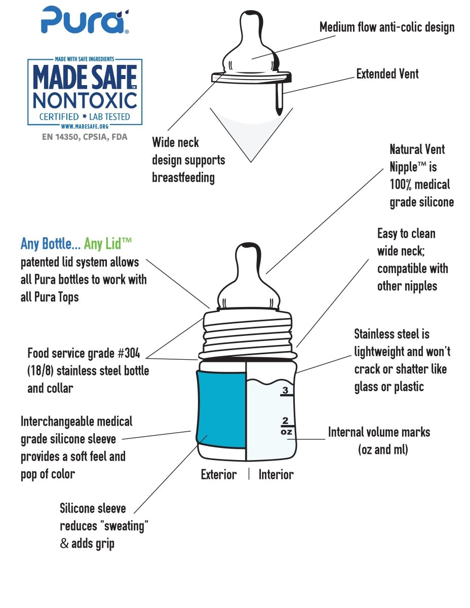 Diese preisgekrönte SchnullerEdelstahlflasche ist die perfekte Trinkflasche für Babys und 100% plastikfrei! Die Flasche ist plastikfrei und daher sicher, umweltfreundlich und vor allem praktisch. Der Deckel ist austauschbar, so dass die Flasche auf verschiedene Arten verwendet werden kann. So kann die Flasche mit dir mitwachsen, von der SchnullerFlasche über den Strohhalmbecher bis hin zur Sportflasche. Pura ist das einzige auf der Welt, das von MadeSafe als NONToxic zertifiziert wurde.org.