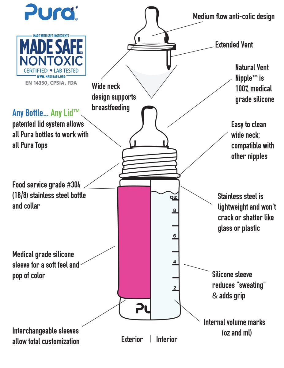 Diese preisgekrönte SchnullerEdelstahlflasche ist die perfekte Trinkflasche für Babys und 100% plastikfrei! Die Flasche ist plastikfrei und daher sicher, umweltfreundlich und vor allem praktisch. Der Deckel ist austauschbar, so dass die Flasche auf verschiedene Arten verwendet werden kann. So kann die Flasche mit dir mitwachsen, von der SchnullerFlasche über den Strohhalmbecher bis hin zur Sportflasche. Pura ist das einzige auf der Welt, das von MadeSafe als NONToxic zertifiziert wurde.org.