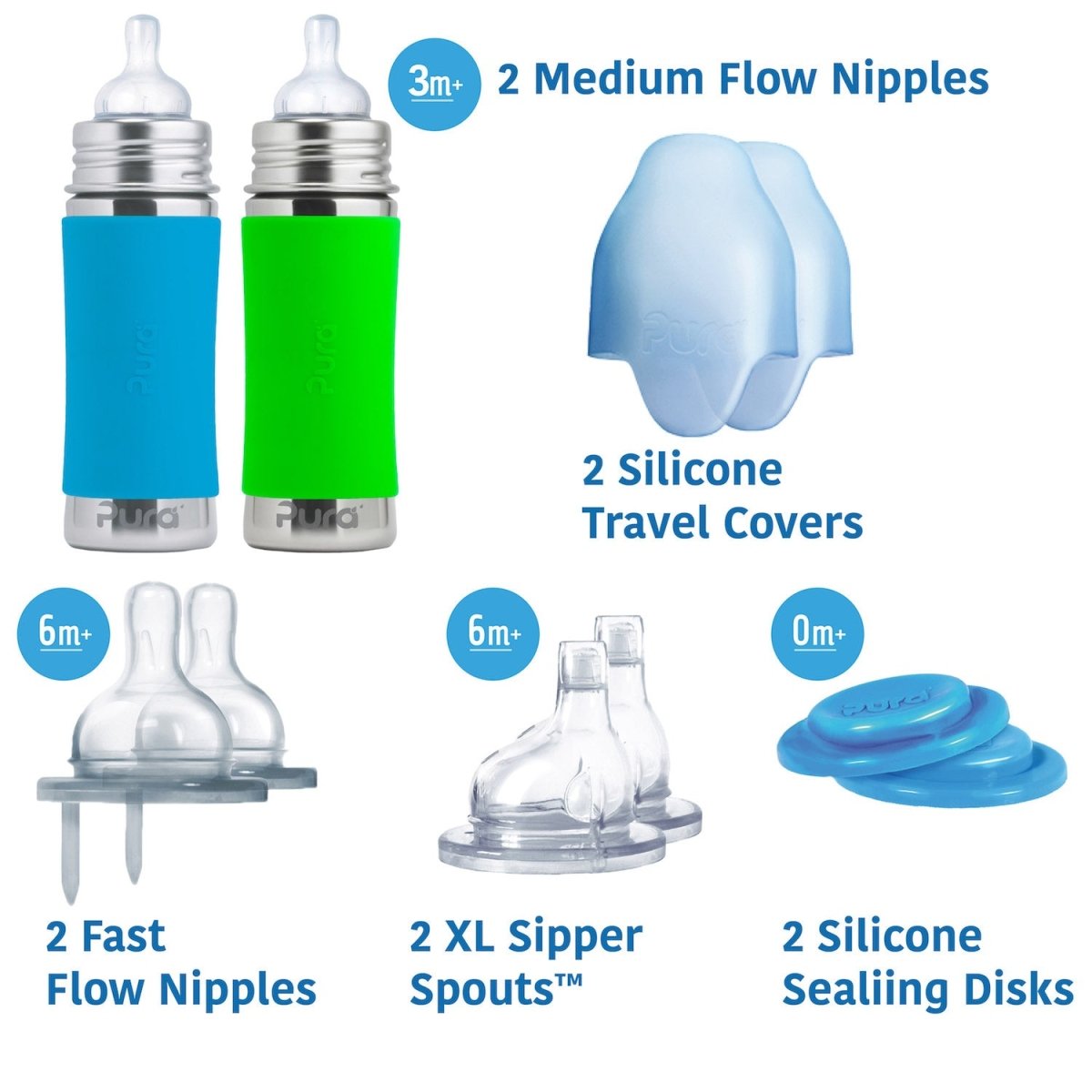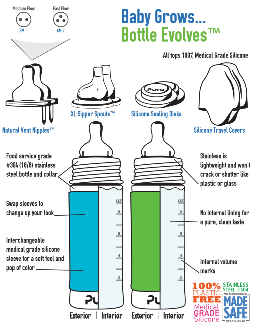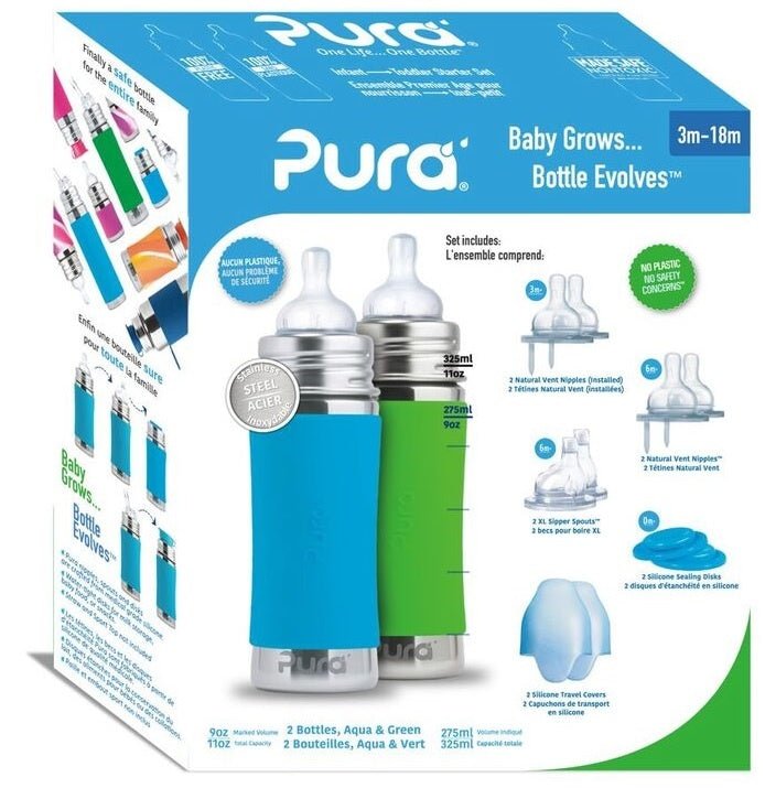 Pura Das preisgekrönte Pura Starterset enthält alles, was du für dein Baby brauchst! Die Pura Flaschen aus Edelstahl sind die perfekten Trinkflaschen für Babys. Pura Flaschen sind 100% plastikfrei und daher sicher, umweltfreundlich und vor allem praktisch. Durch die Möglichkeit, den Aufsatz zu wechseln, kann die Flasche mit dem Kind mitwachsen und wird zum Ausgießerbecher, Strohhalmbecher und Sportkappenbecher. Pura ist das einzige Produkt auf der Welt, das von MadeSafe als NONToxic zertifiziert wurde.org. Pura Das Zubehör besteht aus 100% medizinischem Silikon. Silikon ist ein natürliches Material; es enthält kein Plastik, Latex oder BPA. Sterilisiere sie vor dem ersten Gebrauch. Pura Flaschensauger haben ein patentiertes Anti-Kolik-System, das für einen kontinuierlichen Druck sorgt und verhindert, dass beim Trinken Luft angesaugt wird, um Koliken zu vermeiden. Die Sauger sind so konstruiert, dass sie den variablen Durchfluss beim Stillen nachahmen. Dies wird zum Teil durch mehrere Löcher im Schnuller erreicht. Pura Flaschenspritzen wurden in Übereinstimmung mit den Empfehlungen führender Kinderärzte entwickelt, um die natürliche Entwicklung von Zähnen und Zahnfleisch zu unterstützen. Die Oberseite des Pura Auslaufs ist verstärkt, um dem Beißinstinkt von heranwachsenden Kleinkindern zu widerstehen. Pura Flaschen können zum Einfrieren von Milch verwendet werden. Verwende dazu die Silikondichtscheibe. Ziehe den Verschluss nicht zu fest an und fülle die Flasche nicht zu voll. Wenn du die Flasche zu voll machst, kann sie sich verformen. Das liegt daran, dass sich die Flüssigkeit ausdehnt, wenn sie gefriert. (Nicht mehr als 300 ml in der 325-ml-Flasche). Flaschen aus hochwertigem Edelstahl (#304 oder 18/9); Frei von BPA, PVC, Phthalaten und Blei; Alle Zubehörteile sind aus medizinischem Silikon; Dieses Starterkit enthält: 2 325 ml Pura Kiki-Flaschen; 2 Medium Flow-Sauger; 2 Fast Flow-Sauger; 2 XL-Ausgießer; 2 Dichtungsscheiben; 2 Hülsen; 2 Reisekappen; Gesamtkapazität bis zu 325 ml; Innere Volumenmarke bis zu 250 ml; Größe: 5,7 x 12,7 cm; Gewicht: 182 gr. Reinigung und Sterilisation Alle Teile der Pura Flaschen und des Zubehörs sind spülmaschinenfest. Du kannst sie auch von Hand mit einer milden Seife und einer Flasche und SchnullerBürste waschen. Vermeide die Verwendung von scharfen Reinigungsmitteln, da sie die Silikonteile beschädigen können. Das Zubehör hält länger, wenn es sanft von Hand gereinigt wird. Pura Produkte können auch sterilisiert werden. Lege diese Flasche und das Zubehör für 5-10 Minuten in kochendes Wasser, nachdem der Topf vom Herd genommen wurde und das Wasser nicht mehr aktiv kocht. Silikonteile können auch in der Mikrowelle sterilisiert werden. Hinweis: Der Reiseverschluss garantiert keine 100%ige Dichtigkeit. Halte die Flasche aufrecht oder verwende die Dichtungsscheibe. Die Pura Flaschen haben eine begrenzte lebenslange Garantie.