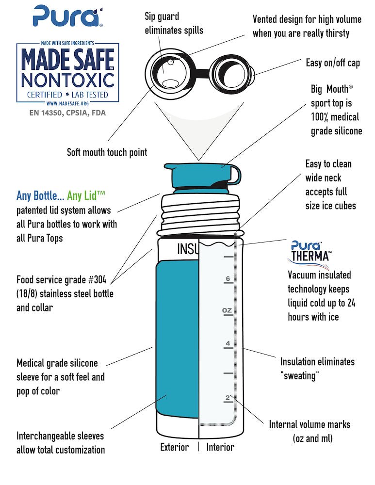 Die Pura Edelstahl-Thermoskanne ist die einzige 100% plastikfreie Ausgießerflasche der Welt und MadeSafe®-zertifiziert. Sie besteht aus hochwertigem Edelstahl und medizinischem Silikon und ist frei von BPA, BPS, PVC, Phthalaten und Blei. Diese preisgekrönte Flasche ist also völlig sicher für dich, deine Familie und die Umwelt