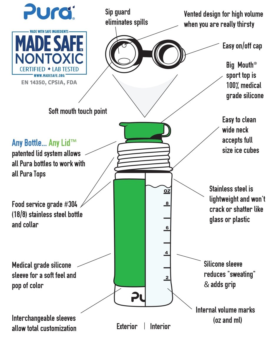 Diese preisgekrönte Sportflasche aus Edelstahl ist die einzige 100% plastikfreie Sportflasche! Die Flasche ist plastikfrei und damit sicher, umweltfreundlich und vor allem praktisch. Der Deckel ist austauschbar, so dass die Flasche auf verschiedene Arten verwendet werden kann. Bei Erwachsenen kann die Sportmütze z. B. durch einen Sportstrohhalm ersetzt werden. Die Flasche kann aber auch für Kinder verwendet werden, indem du den Deckel durch Schnuller, eine Tülle oder einen Kinderstrohhalm ersetzt. Pura ist das einzige auf der Welt, das von MadeSafe als NONToxic zertifiziert wurde.com.