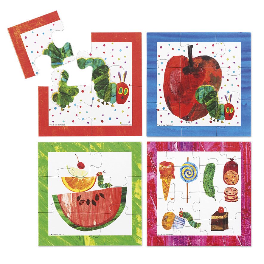 Dieses Set besteht aus 4 Puzzles mit farbenfrohen Bildern aus dem Buch Caterpillar Never Enough von Eric Carle. Darin geht die kleine Raupe auf die Suche nach leckeren Happen, die auch auf den Puzzles zu finden sind. Die jüngsten Puzzler beginnen mit einem 4-Teile-Puzzle und wer für die nächste Herausforderung bereit ist, kann ein 6-, 9- oder 16-Teile-Puzzle lösen.