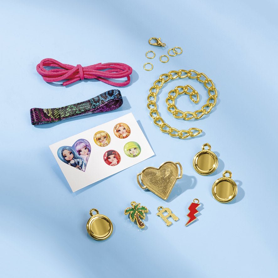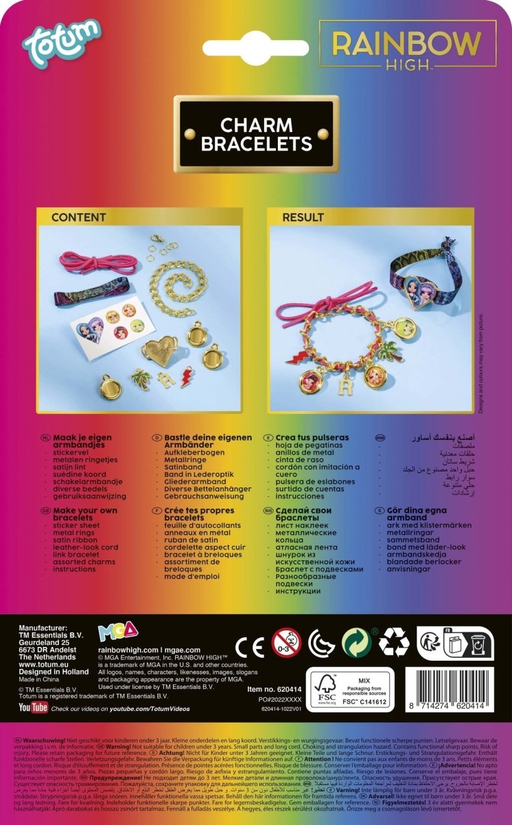 Mache deine eigenen Bettelarmbänder mit diesem lustigen Set von Totum - Rainbow High! Das Set enthält zwei Armbänder und goldene Charmes. Gestalte dein eigenes Armband aus luxuriösem Satinband mit Herz-Charm und Stickern und verziere ein goldfarbenes Gliederarmband mit Velourslederkordel mit Metallpalme und Blitz-, R- und 2D-Sticker-Charms. So entscheidest du, wie deine schönen Armbänder aussehen werden!