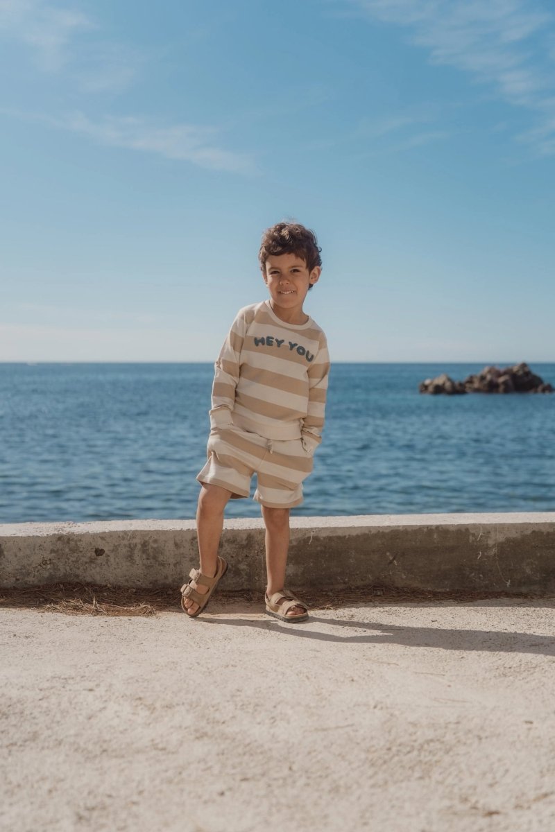 Bequem und verspielt, genau das, was ein Sommertag braucht. Diese Shorts in Biskuitfarbe mit Streifenmuster sind aus einer weichen Sweatqualität gefertigt, die sich wunderbar trägt. Der elastische Bund mit Kordelzug sorgt für einen angenehmen Sitz, während die Umschläge an den Beinen und die Seitentaschen einen coolen, aber weichen Look verleihen. Die aus 100 % Bio-Baumwolle hergestellten und Öko-Tex-zertifizierten Shorts sind weich auf der Haut und ideal für aktive Tage.