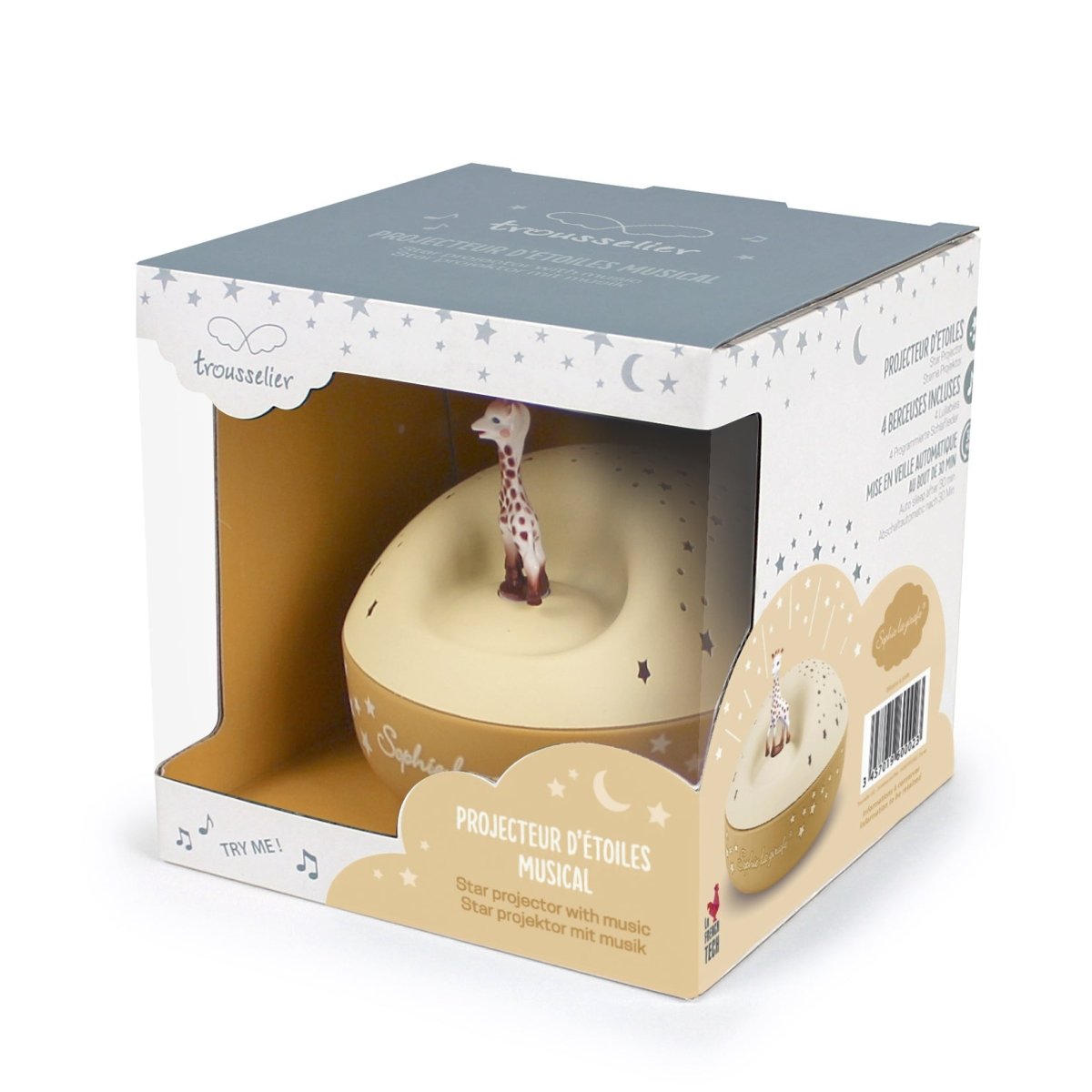 Mit diesem Sophie de Giraf Sternenprojektor von Trousselier kann dein Kind wunderbar unter den Sternen schlafen! Der Sternenprojektor projiziert einen Sternenhimmel an die Decke und die Wand, während sich die Sophie-Giraffenfigur gleichzeitig im Kreis dreht. Und das ist noch nicht alles: Der Projektor macht auch Musik! Du kannst zwischen ruhiger Schlafmusik oder natürlichen Klängen wählen. Der Projektor schaltet sich nach 30 Minuten automatisch aus. schöne bunte und animierte Projektionen, die Babys Aufmerksamkeit erregen; Musik: die Wahl zwischen einem fröhlichen Schlaflied oder Naturgeräuschen; praktisch: der Projektor schaltet sich nach 30 Minuten automatisch ab; geeignet ab 10 Monaten; läuft mit 3 AA-Batterien (im Lieferumfang enthalten); Maße: 12 x 12 x 10,5 cm.