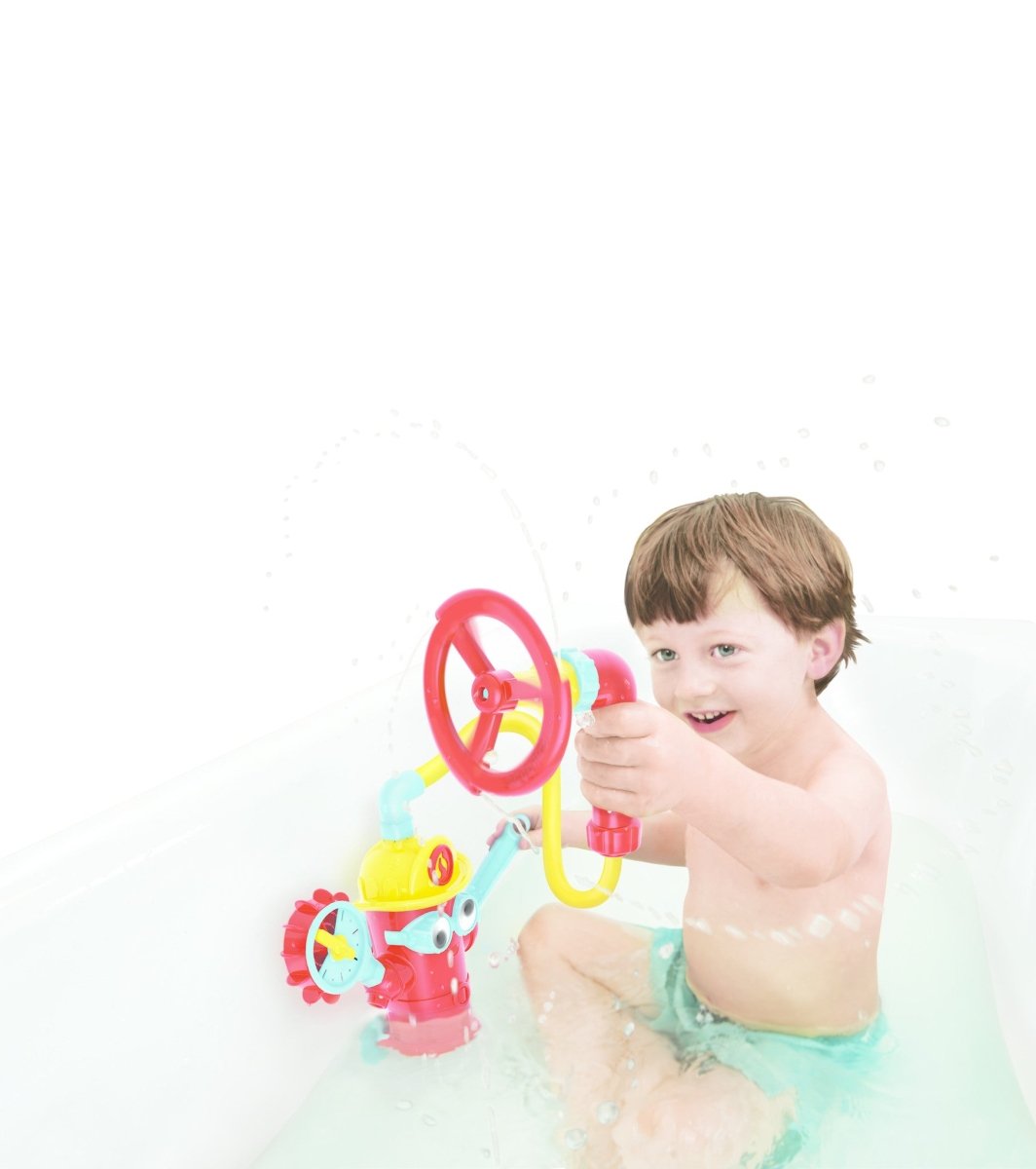 Die Feuerwehrpumpe ist natürlich ein hervorragendes Spielzeug für die Badewanne oder das Schwimmbad. Stell die Pumpe mit dem Boden ins Wasser und pumpe mit dem blauen Hebel Wasser hinein. Dann kannst du natürlich alle nass spritzen oder ein anderes Spielzeug am Schlauch befestigen, damit ihr schön spielen könnt.